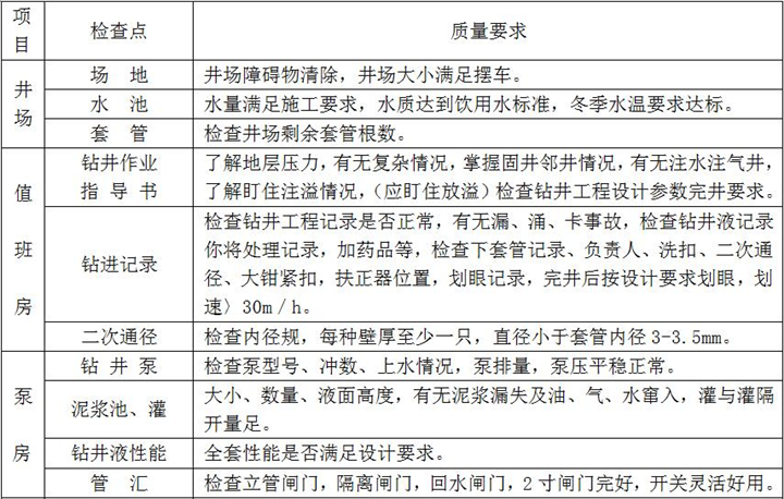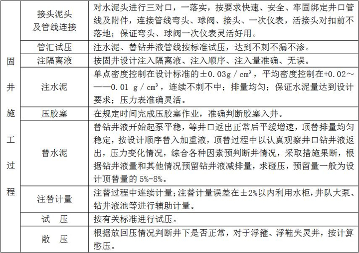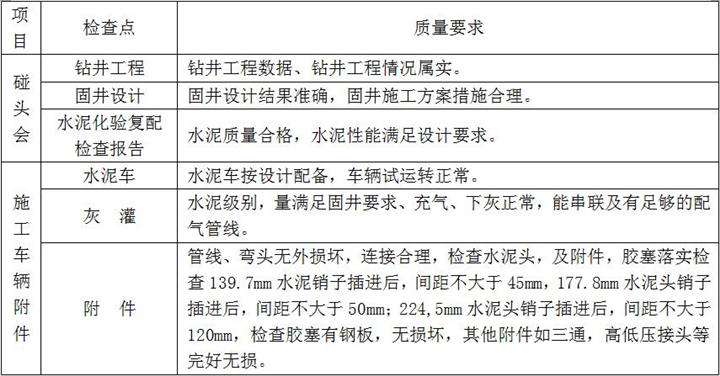 2、固井施工:按設(shè)計(jì)注入隔離液,水泥漿壓膠塞,頂替鉆井液、碰壓、試壓完成、固井施工過程檢查點(diǎn)項(xiàng)及要求如下: